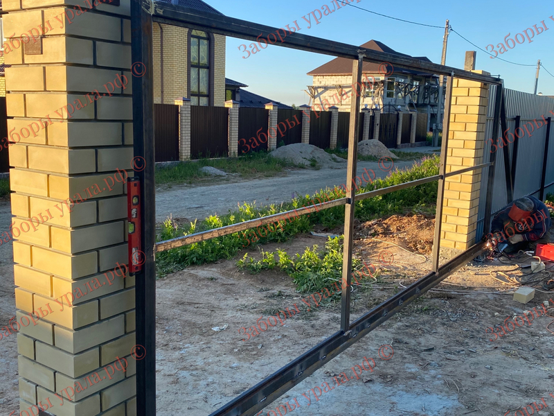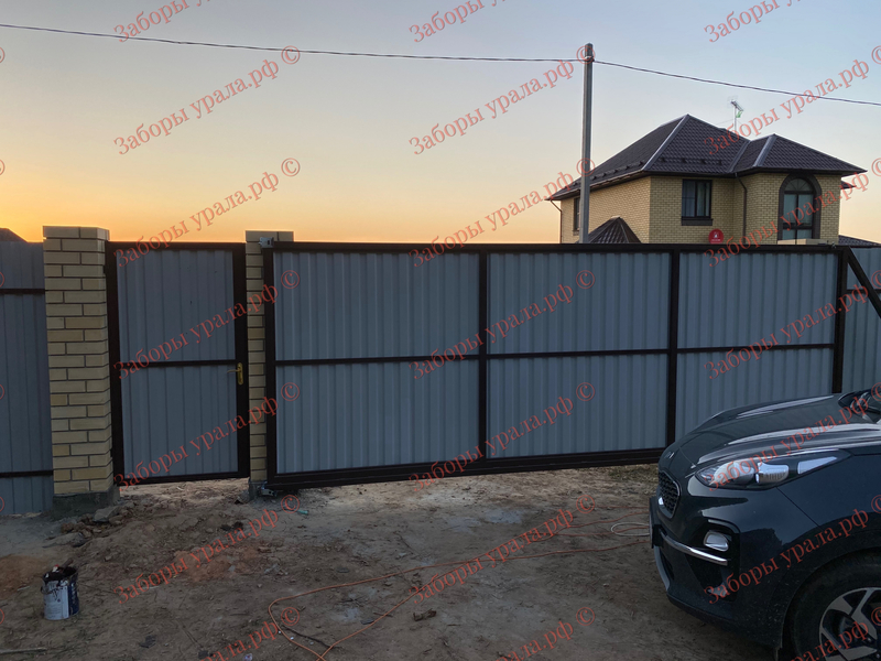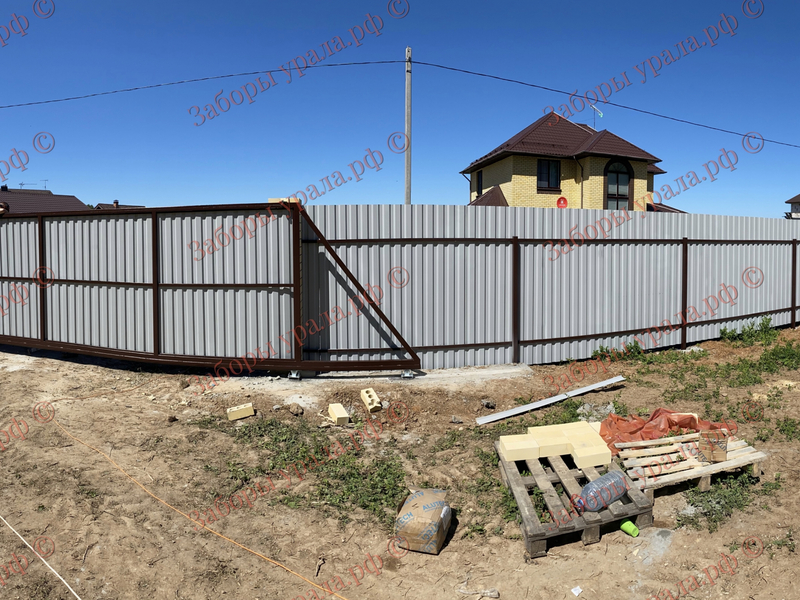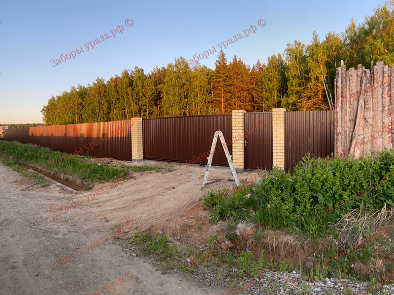 д. Гусева (Лисьи горки) - забор 160м из профнастила с откатами воротами и кирпичными столбами
