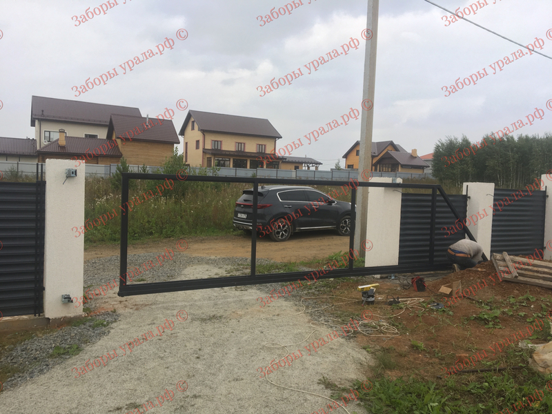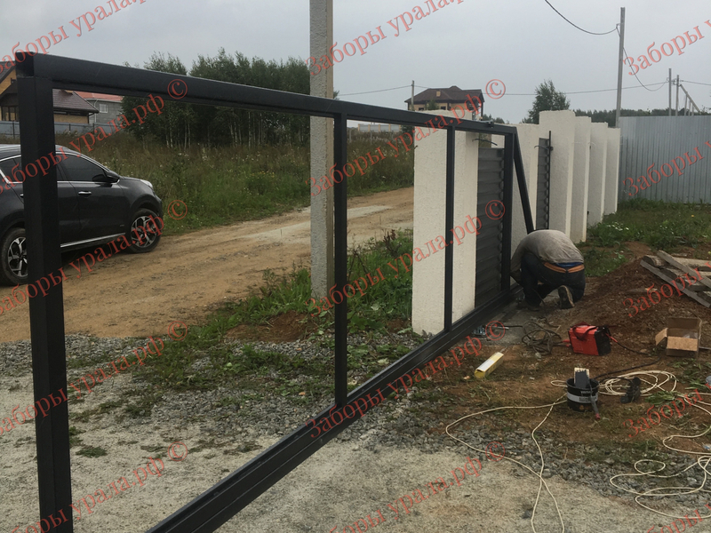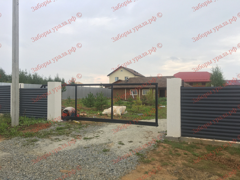 Георгиевские дачи (Исток) - забор из горизонтального штакетника 40м с кирпичными столбами и Откатные ворота