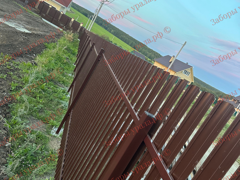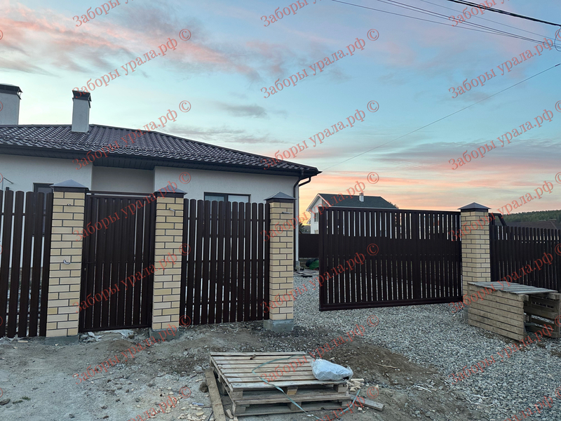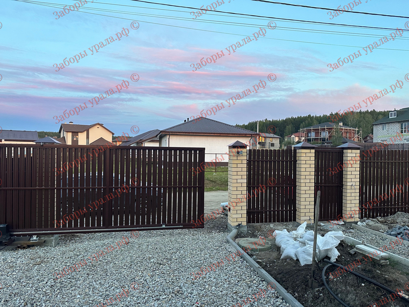 Проект включал монтаж забора из металлического штакетника протяженностью 140 метров и установку откатных ворот с кирпичными столбами.